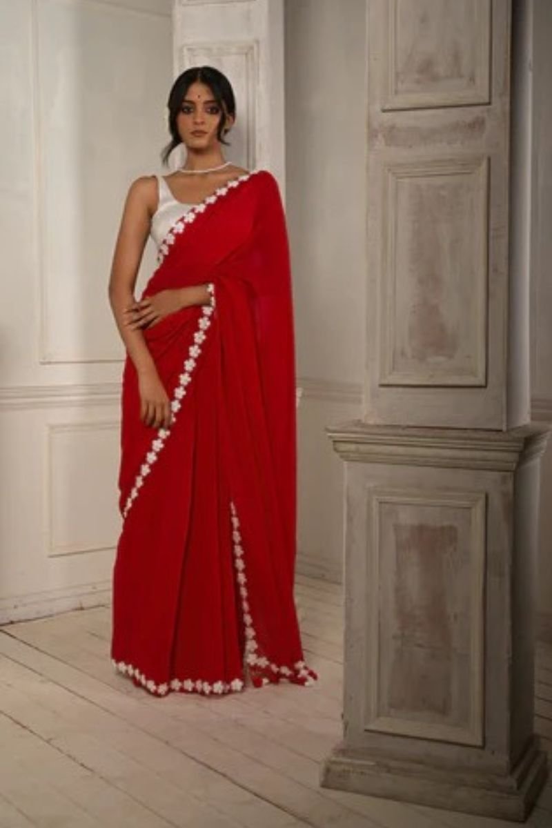 Description: This product image showcases a timeless red saree adorned with an elegant white lace border, paired with a sleeveless white blouse. The minimalist yet striking design makes it an excellent pick for both festive gatherings and contemporary occasions, combining tradition with modern style