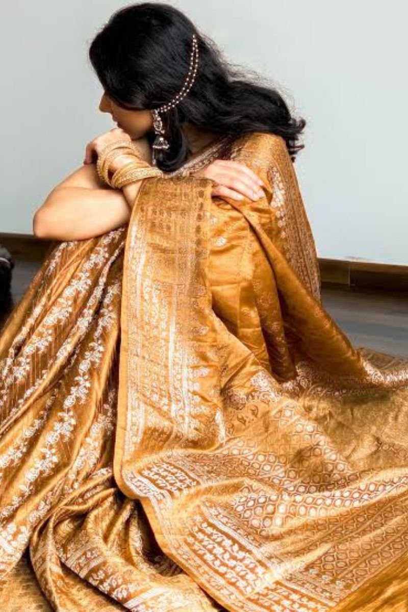 This exquisite Banarasi silk saree features a rich golden hue with elegant woven patterns, ideal for festive occasions and celebrations. The saree is crafted from premium silk, offering a luxurious drape and a timeless, traditional appeal. Perfect for weddings, parties, and special events, it pairs beautifully with traditional jewelry to complete your ethnic look
