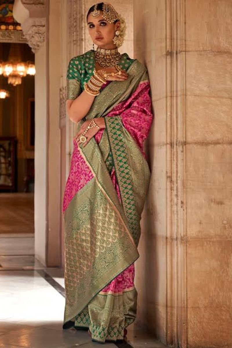 A traditional Banarasi silk saree in an eye-catching combination of green and pink, featuring intricate woven patterns and a luxurious sheen. This saree is ideal for festive occasions, weddings, and special celebrations. Its beautiful color contrast and classic zari work highlight timeless elegance and Indian craftsmanship