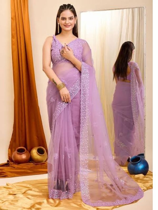 This stunning lavender sheer saree is highlighted by delicate embroidered details and a lightweight fabric, perfect for party wear and festive gatherings