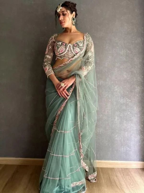 Elevate your party look with this graceful mint green net saree, featuring exquisite floral embroidery and sequins for a contemporary, chic appeal