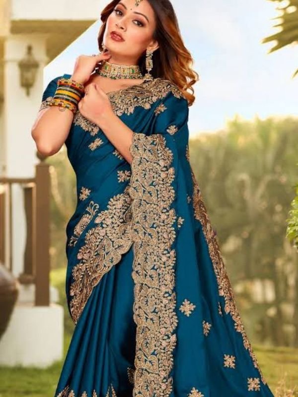 This stunning royal blue saree features elaborate golden embroidery and intricate detailing throughout. Crafted from premium quality fabric, it’s perfect for weddings, receptions, and festive occasions. The rich color and ornate embellishments give it a regal look, making it an ideal choice for grand celebrations
