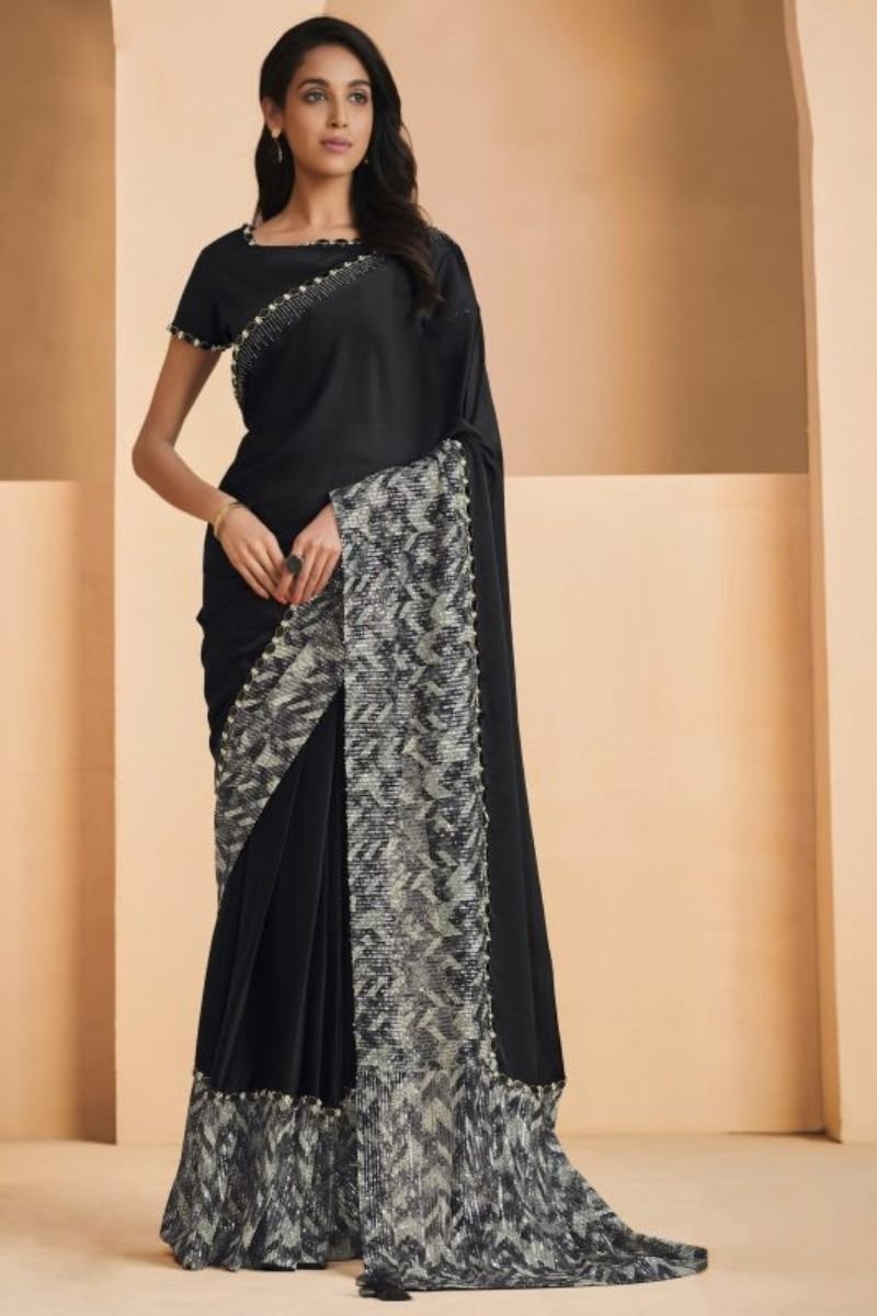 Satin Crepe Silk With Embroidery Sequins & Stone Work Designer Un Stitched Saree