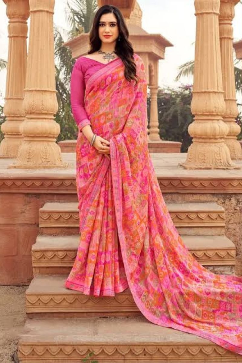 Description: This product image showcases a lively pink Bandhani saree with intricate patterns and multicolored motifs, paired with a matching blouse. The bright hues and traditional tie-dye technique make it an ideal choice for festive occasions, wedding functions, and cultural celebrations, adding a joyful and elegant flair to any look